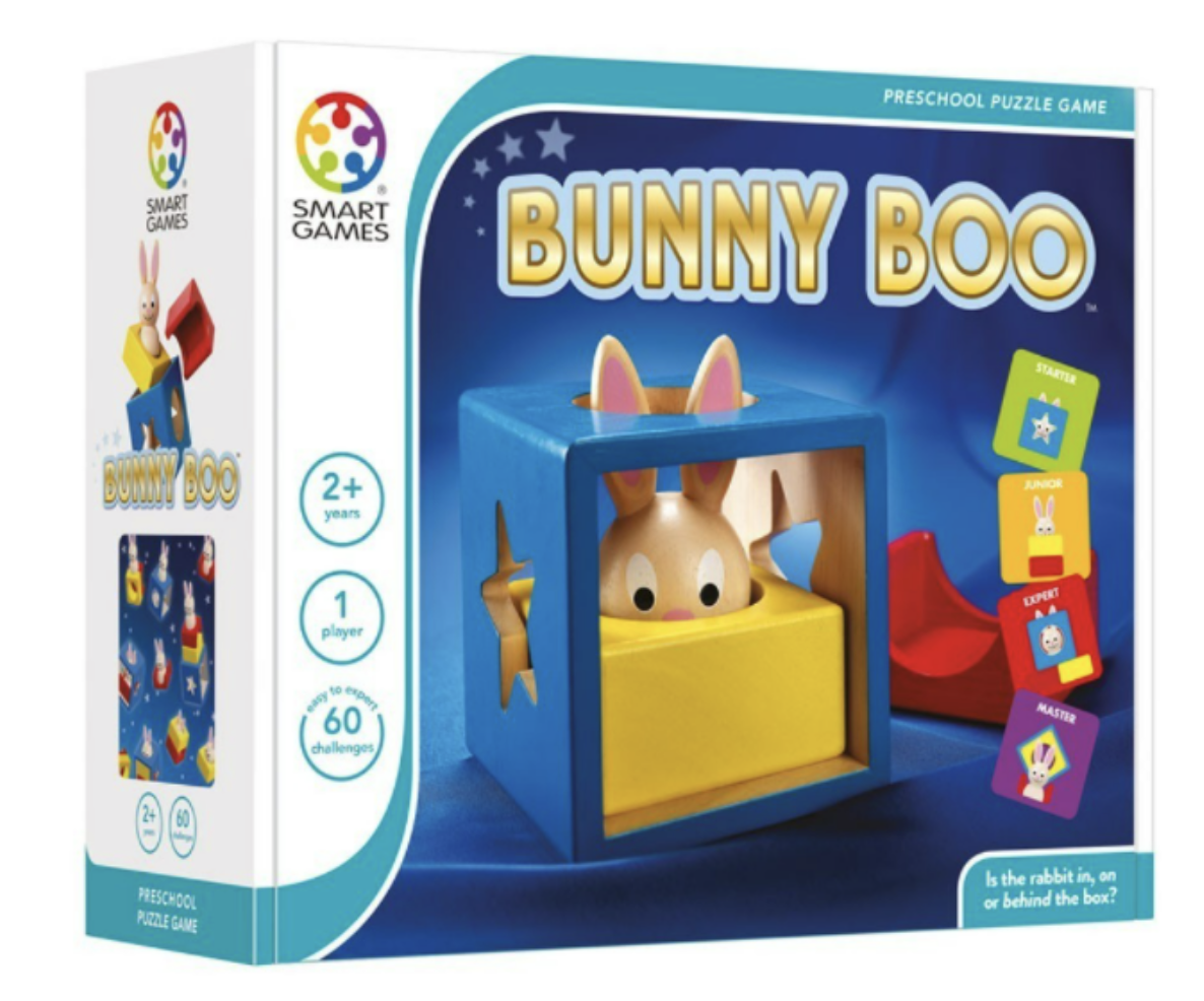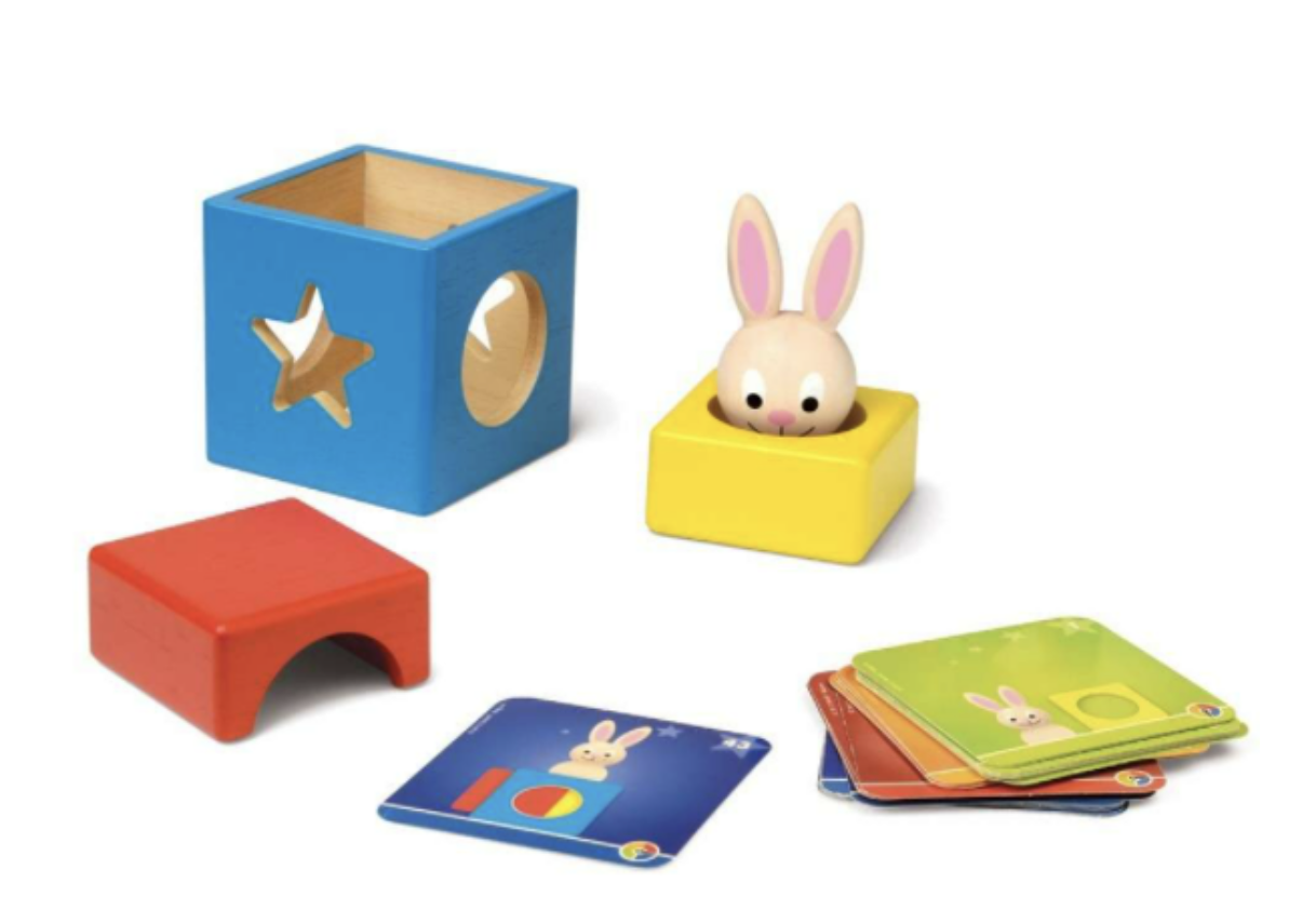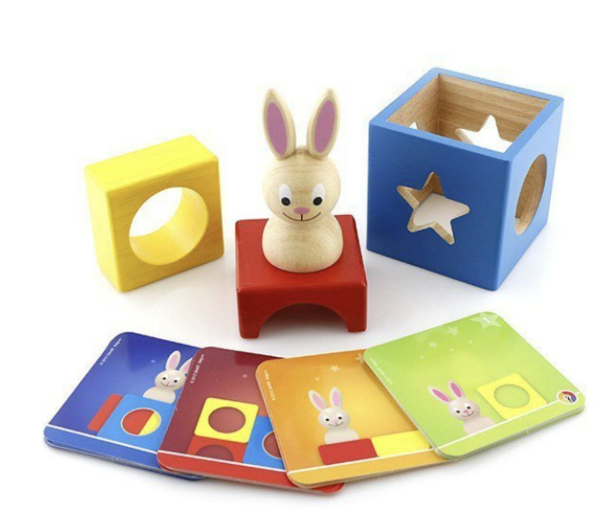 Puxa um coelho para fora da caixa! O coelho está a espreitar pelo buraco redondo ou em forma de estrela? Está em cima do bloco amarelo, vermelho ou azul? Alguns desafios podem parecer semelhantes mas a solução pode ser completamente diferente dependendo do quão longe as orelhas do coelho se destacam. Uma excelente forma de treinar a percepção das imagens e aplicar o que observam a 2 dimensões no espaço, Como “acima/abaixo”, “dentro/fora”, “visível/oculto” e etc.