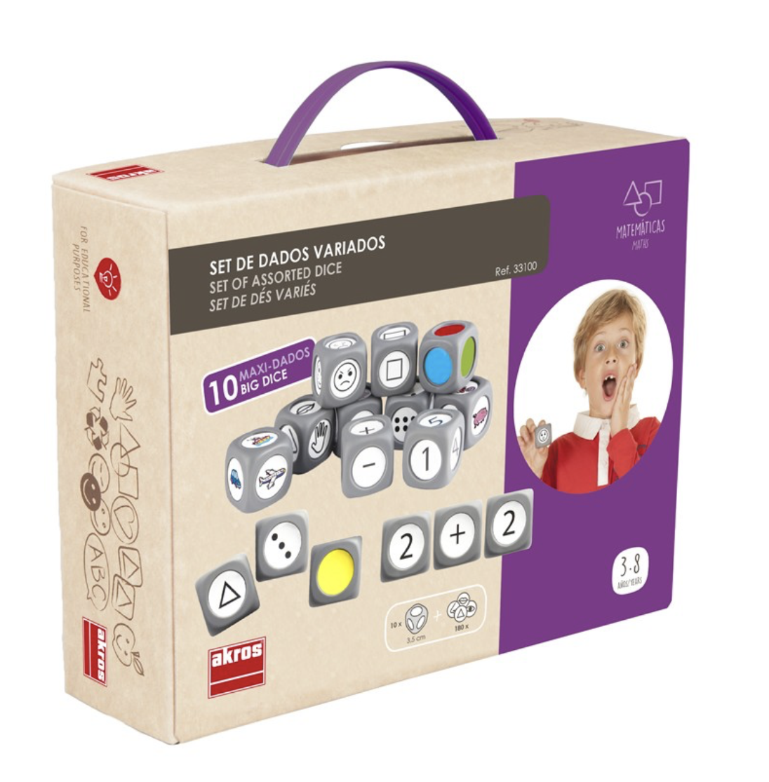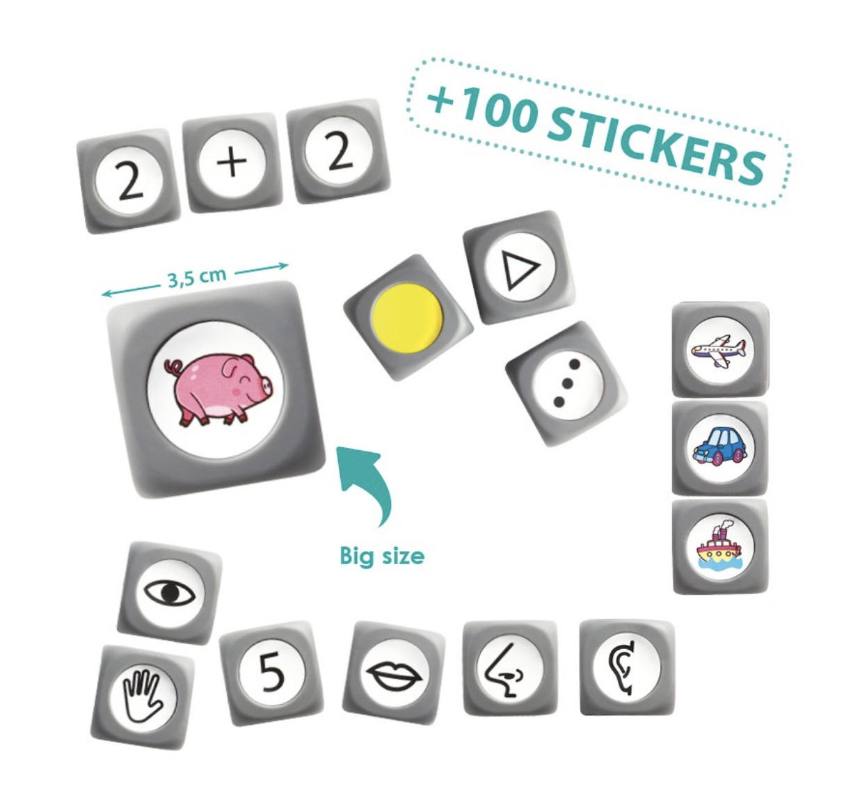 Contém 10 dados que podem ser personalizados com mais de 100 autocolantes, para poder trabalhar diversos conceitos linguísticos como: