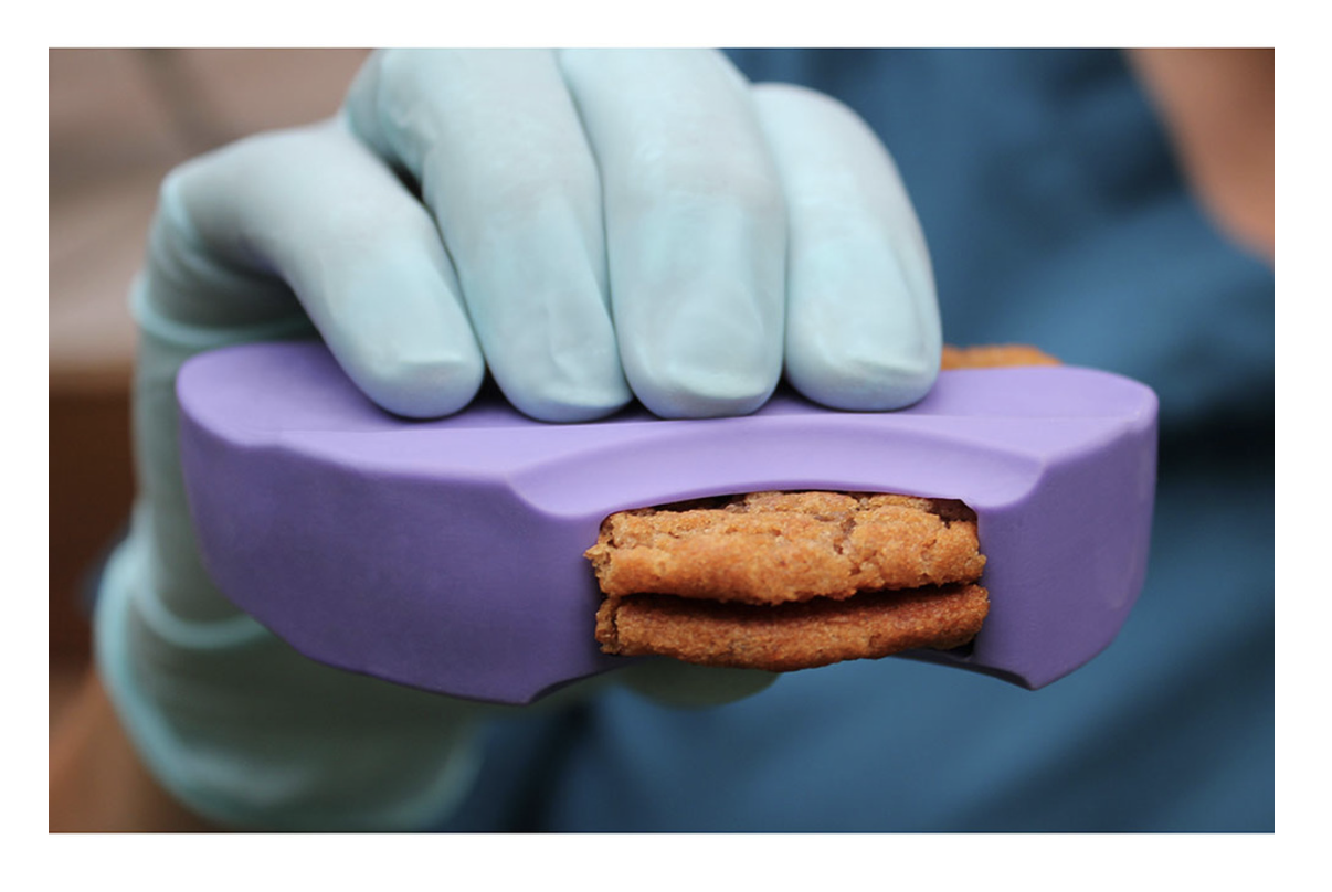 O alimento é introduzido dentro do recipiente (ex: pão, bolachas, maçã, etc.) e sai, através do orifício, a quantidade que se deseja para poder ser utilizado em tarefas de trabalho mastigatório e de deglutição.