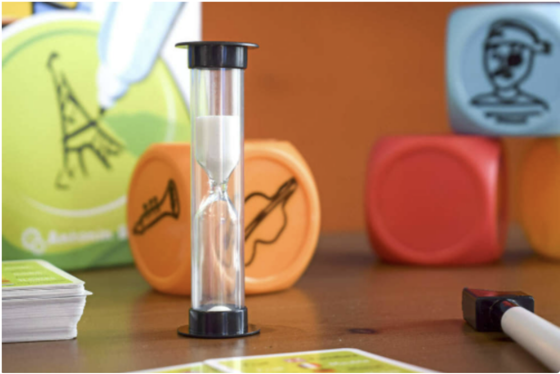 Inclui: 6 dados grandes e apagáveis, 6 placas apagáveis, 6 marcadores/apagadores, 1 ampulheta de 2 minutos e 50 cartões temáticos de dupla face (200 temas no total)