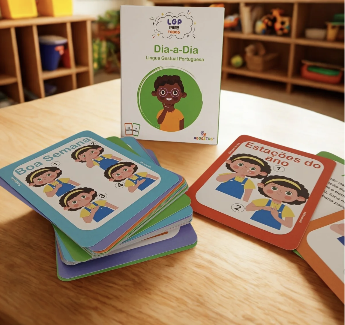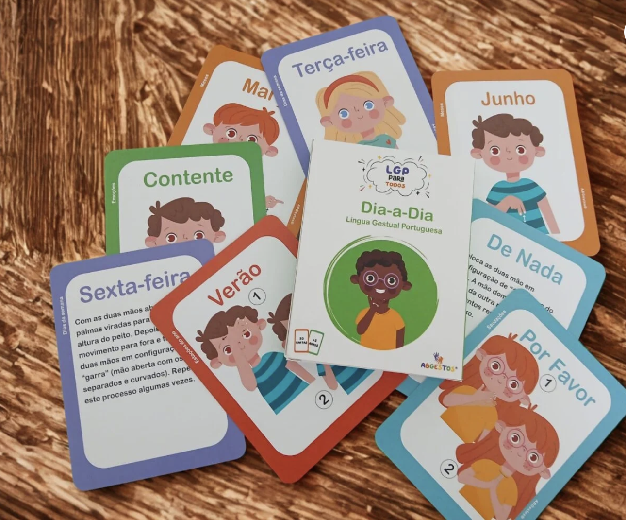 Torne a aprendizagem da Língua Gestual Portuguesa mais prática com o conjunto Dia-a-Dia. São 50 cartas educativas que reúnem os gestos mais usados no quotidiano.