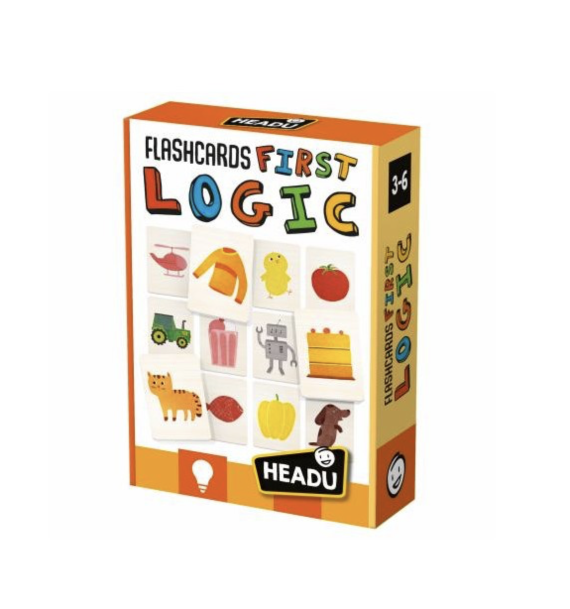 • Caixa de flashcards FIRST LOGIC para idades 3-6 anos com imagens coloridas de objetos e animais.